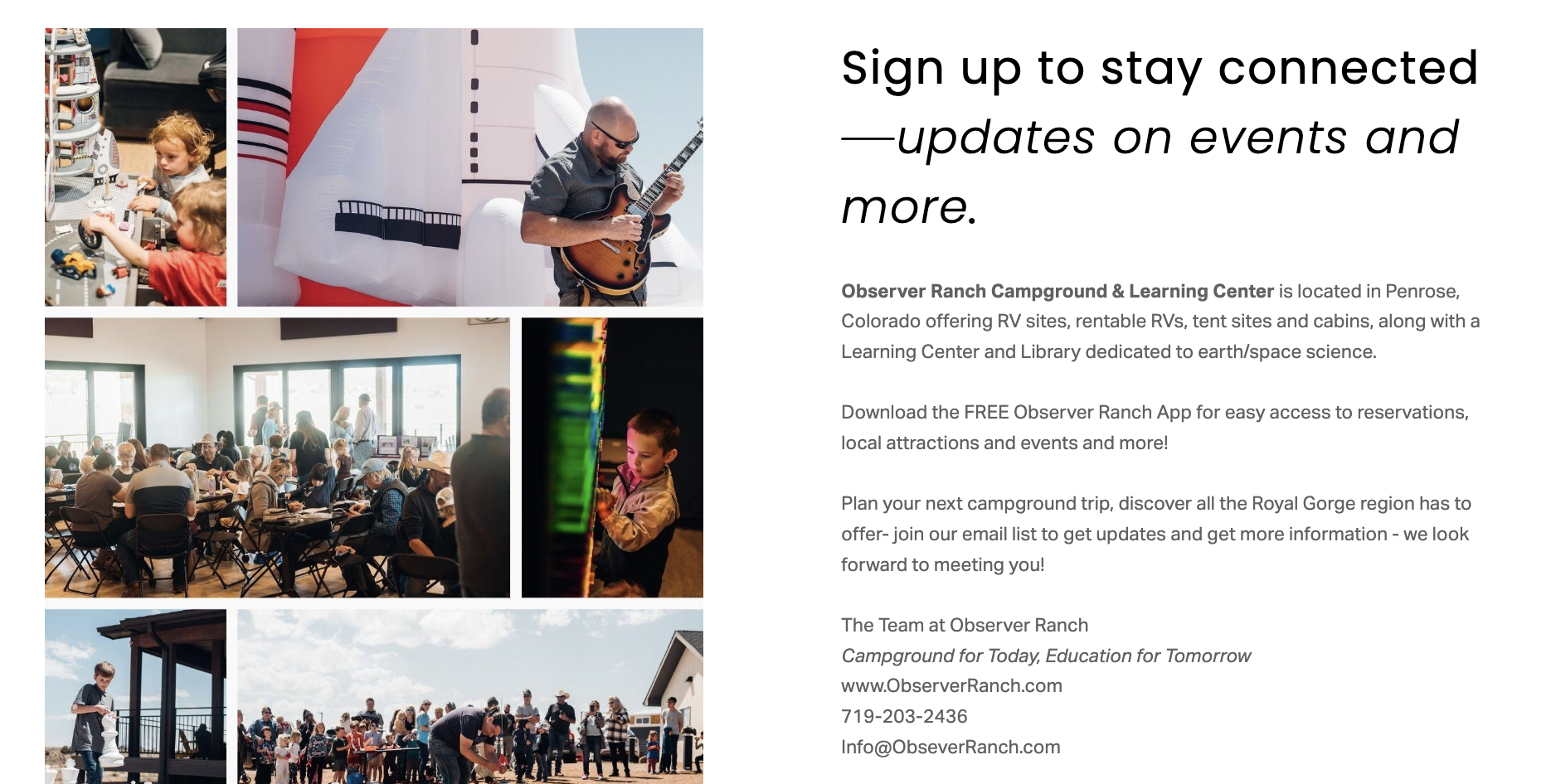 Discover a year-round, family-friendly campground just one hour south of Colorado Springs, featuring breathtaking mountain views, a unique learning center and library focused on space and nature, and unforgettable adventures—book your stay today!